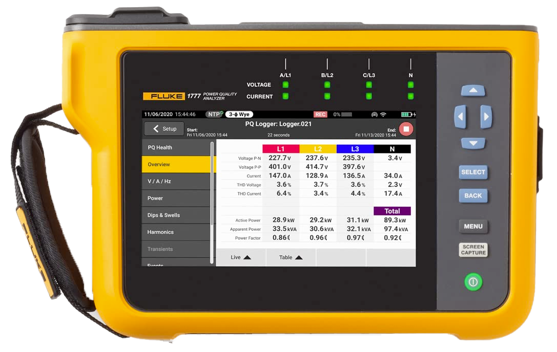 - Intuitive user interface makes it easy to navigate between measurement parameters like V/A/Hz, power, dips and swells, harmonics, or PQ health at the push of a button
