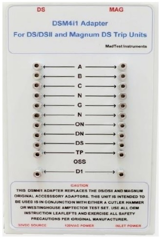 The MadTest Instruments DSM4i1 Adapter is an alternative adapter option that replaces the need for both the Eaton Cutler Hammer 8779C02G03 DS/DSII and Eaton Cutler Hammer 8779C02G04 Magnum adapters. The unit offers a 32VDC power supply to replace the Eaton Cutler Hammer PRTAAPM Auxiliary Power Module for DIGITRIP trip units, and the unit is supplied with a standard 120VAC outlet for the Eaton Cutler Hammer 140D481G03 Secondary Injection Test Set power needs.